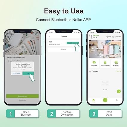 • ✅【Easy to Use】NELKO label printer compatible with IOS & Android Phone via bluetooth connection. Step 1: Download “Nelko” APP from Google Play or App Store. Step 2: Install the paper roll. Step 3: Connect the P21 bluetooth within APP. Step 4: Choose a quick template and start printing. It is not compatible with Google phones on Android 14. This label maker machine with tape APP included more than 90 +Fonts, 10+ Languages, 450+ Materials. (Note: This label maker doesn’t work with computers)